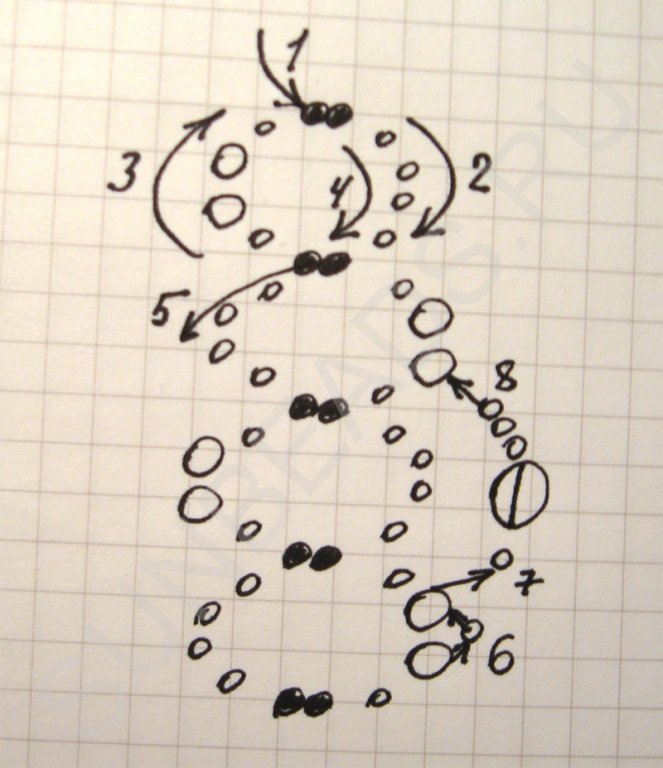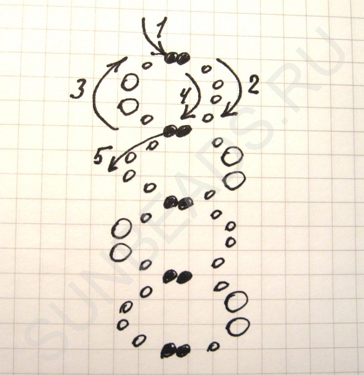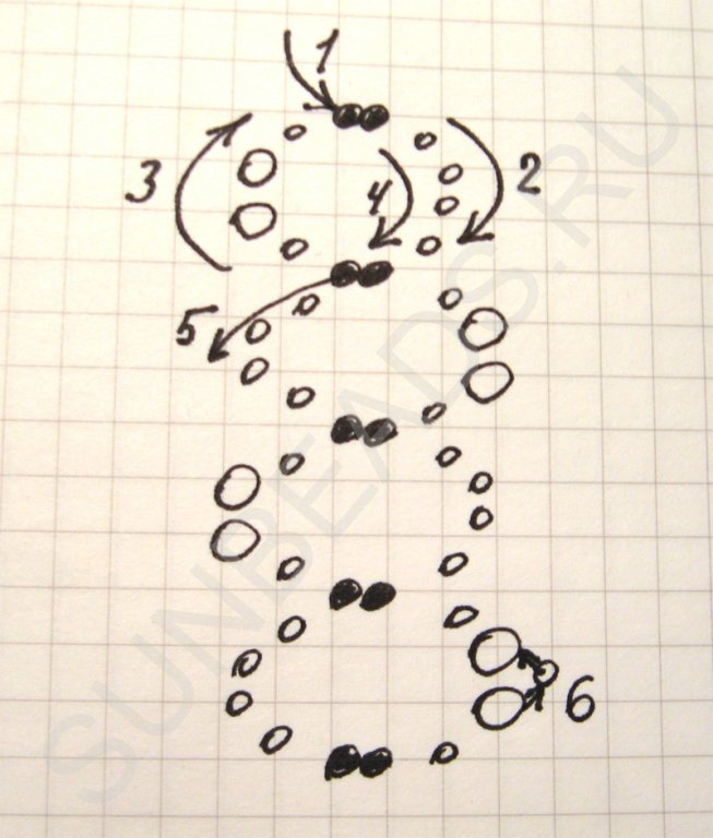 По этой схеме плетем простую бисерную цепочку из бисера двух размеров 11 и 8. Крупными кругляшками на схеме я показала бисерины размера 8: