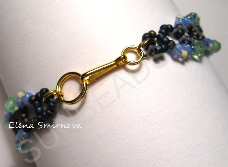 Используем плетеные на торцах браслета бисерные кольца. Присоединяем к ним замок и металлические кольца: