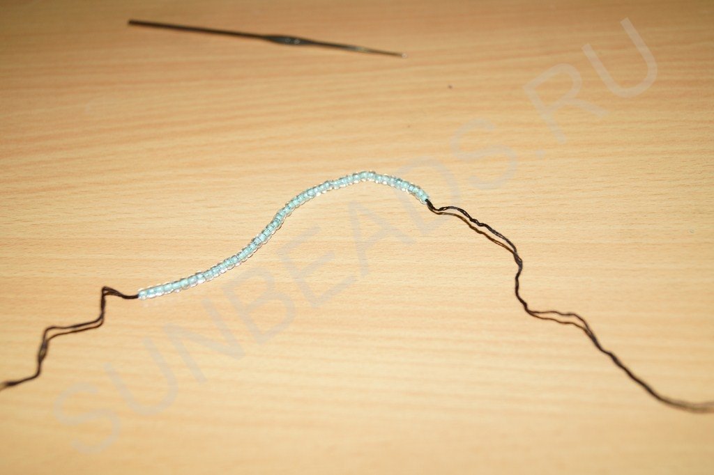 Теперь начинаем провязывать второй ряд. Для этого продеваем крючок ПЕРЕД первой бисериной первого ряда: