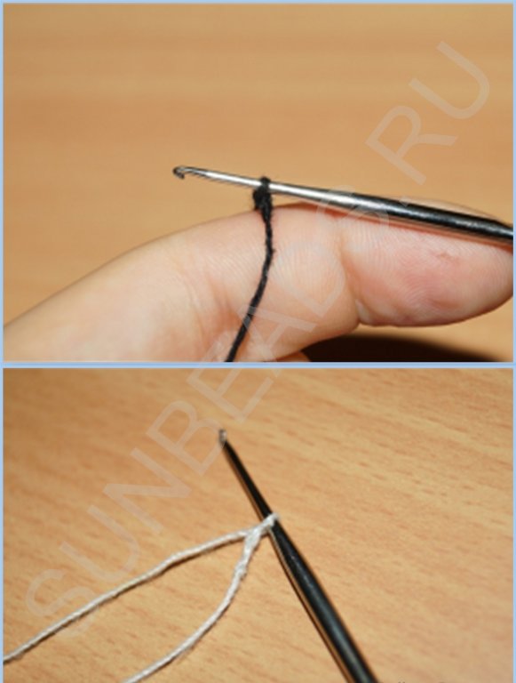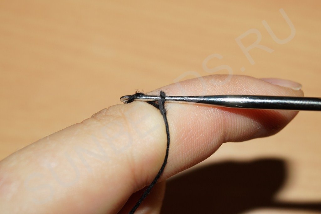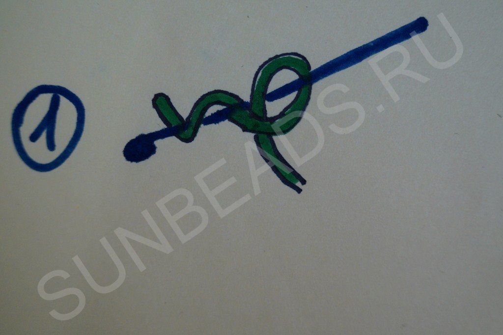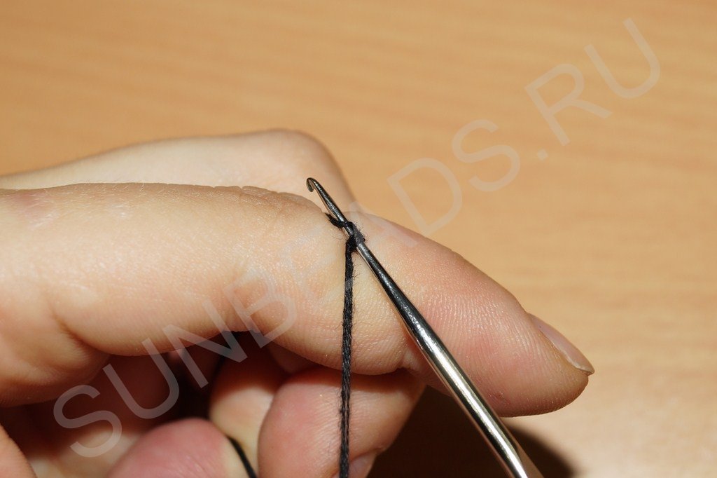 Вводим под низ нити крючок и поворачиваем его, создавая снизу незакрепленный узелок:
