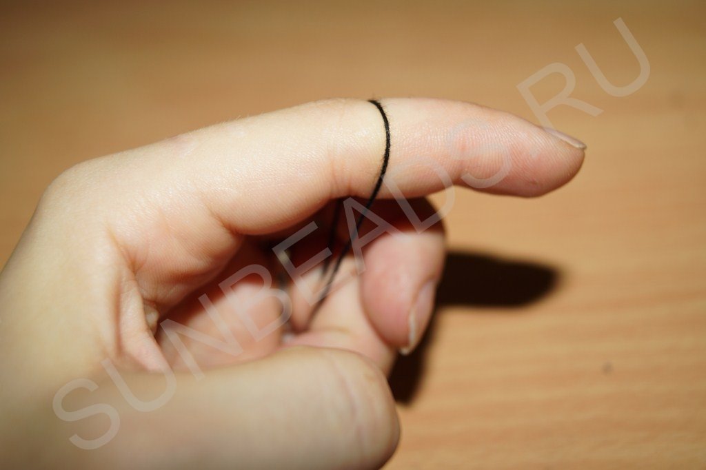 На указательный палец левой руки накидываем нитку. Коротенький хвостик ее оказывается внутри ладони, длинный снаружи.