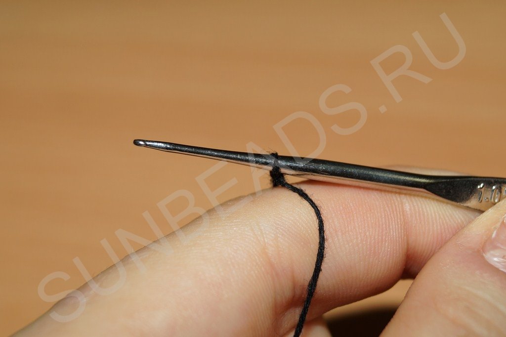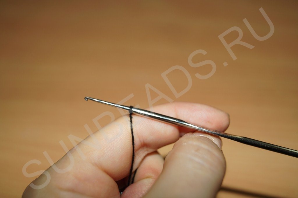 С этой петельки начнем ввязывать бисерины второй части жгутика. Для этого берем крючок, вводим его в петлю, захватываем нитку: