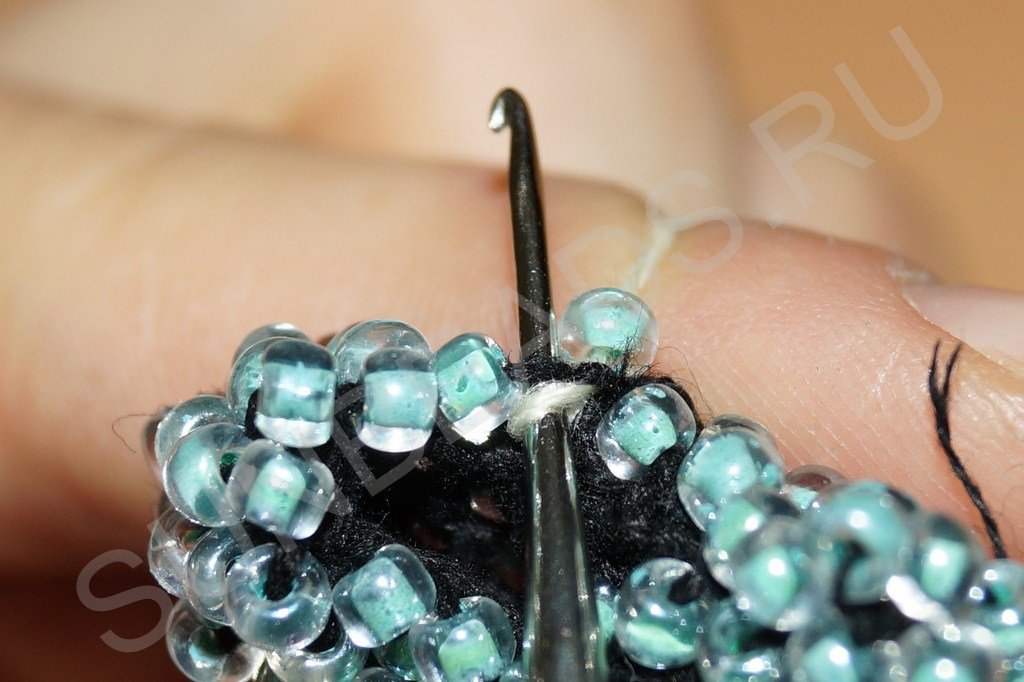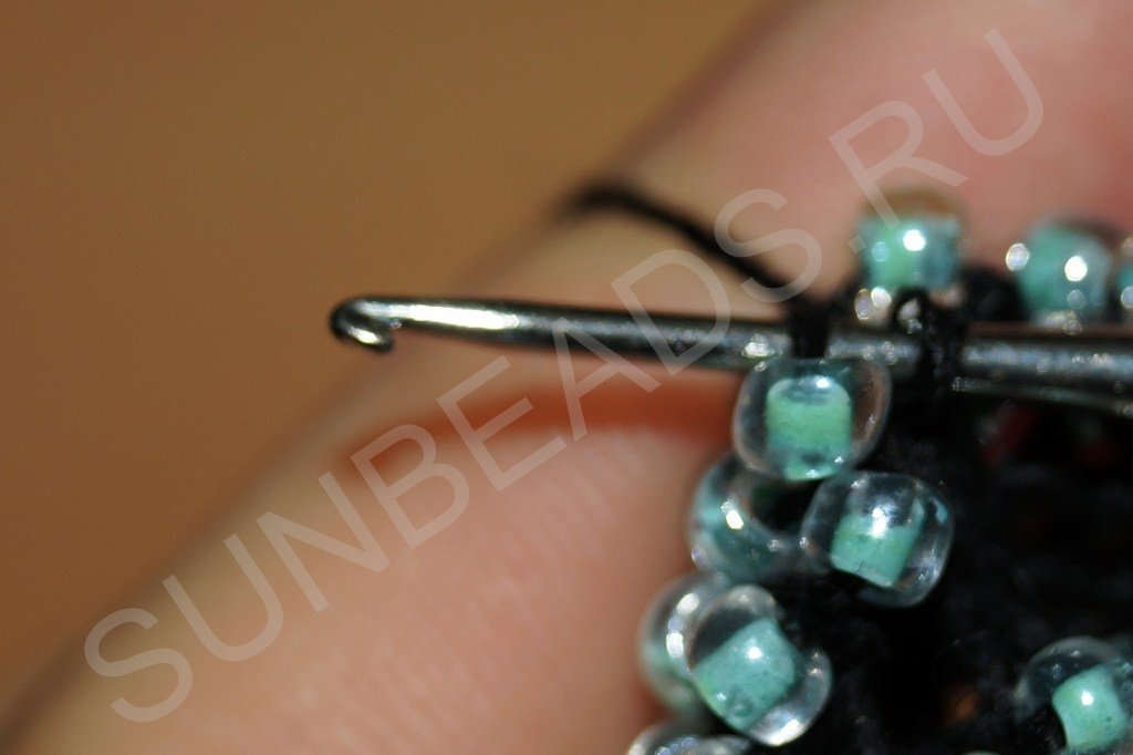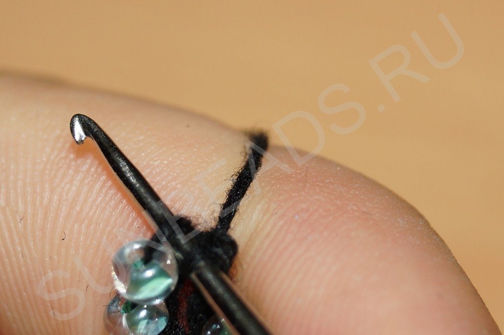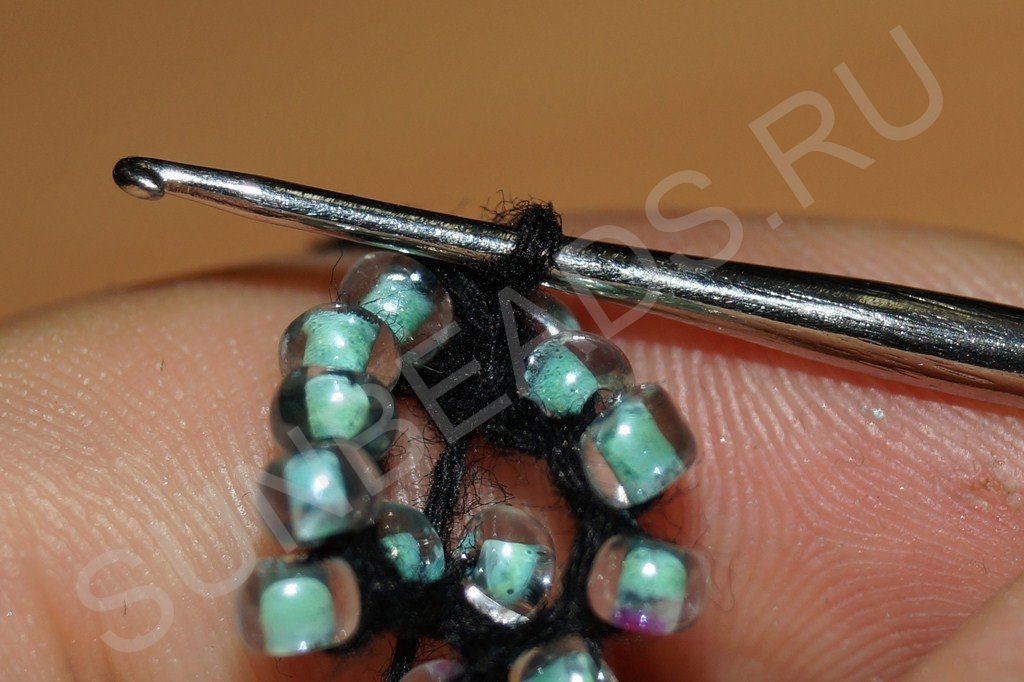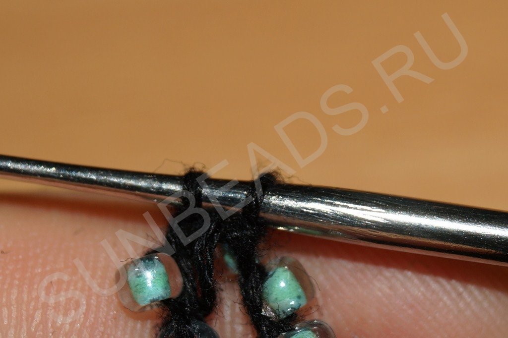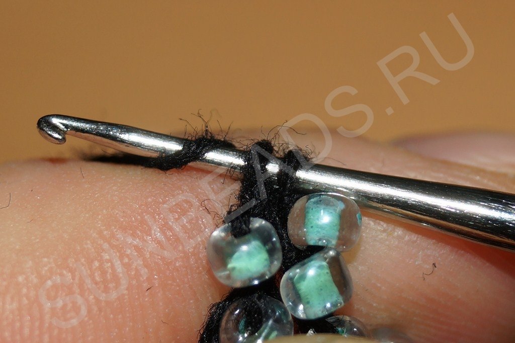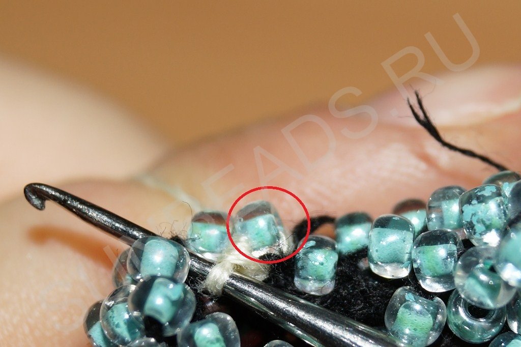 Затем крючком захватываем нить, расположенную сразу за бисериной: