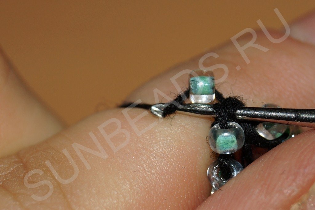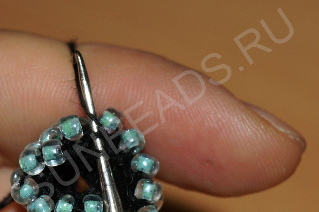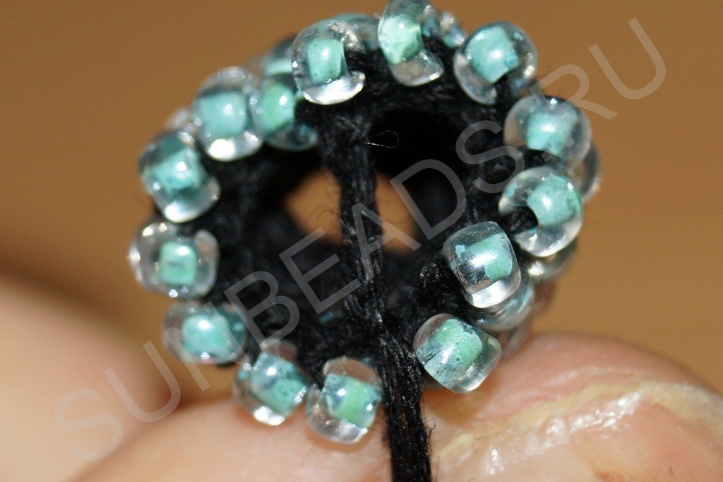 Пододвигаем вплотную к уже связанному кольцу следующую бисерину: