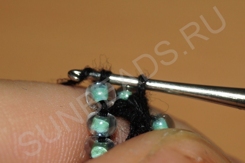 Теперь приступаем к провязыванию бисерин первого ряда. Для этого к воздушным петлям вплотную пододвигаем одну бисерину: