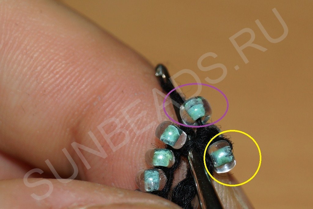 На следующем фото в желтом кружке показана первая привязанная бисерина второго ряда. В фиолетовом вторая рабочая бисерина второго ряда. Она еще не привязана, но уже придвинута к полотну для ввязки: