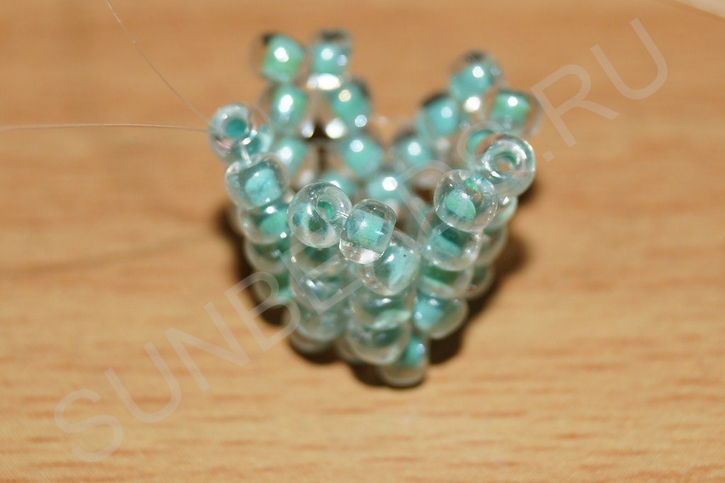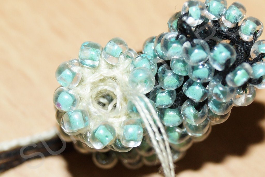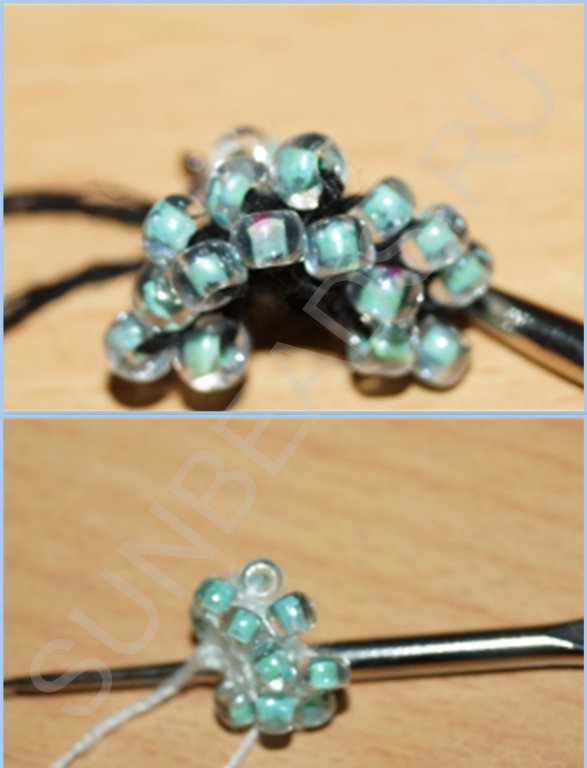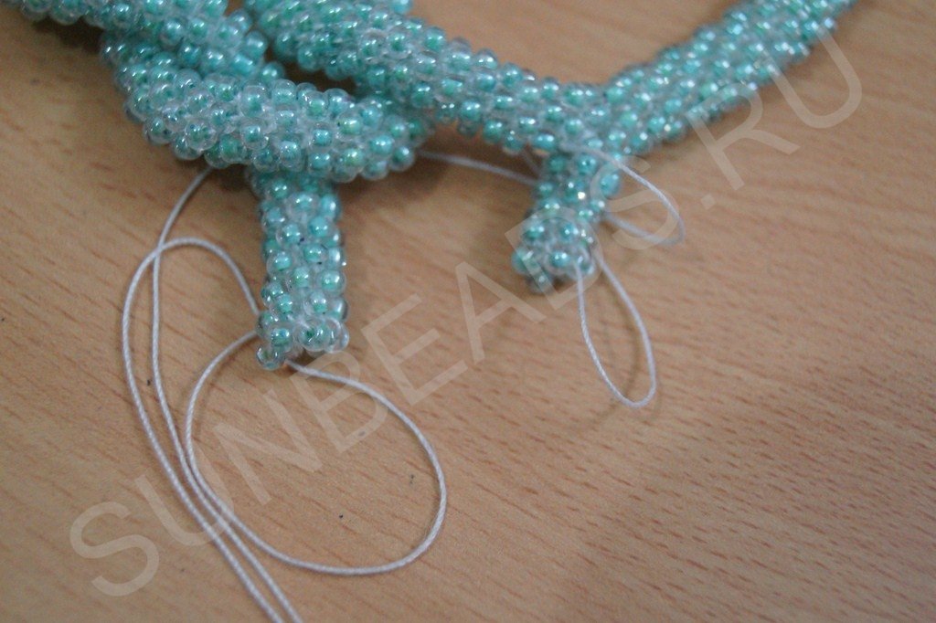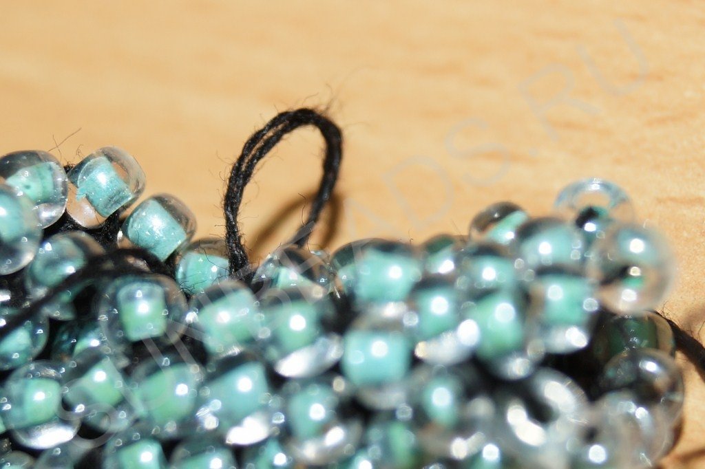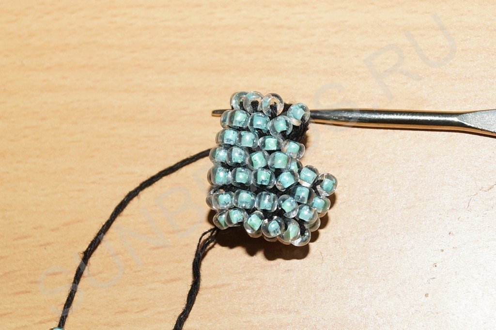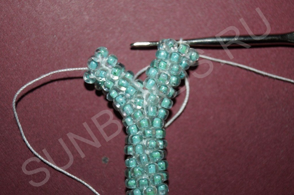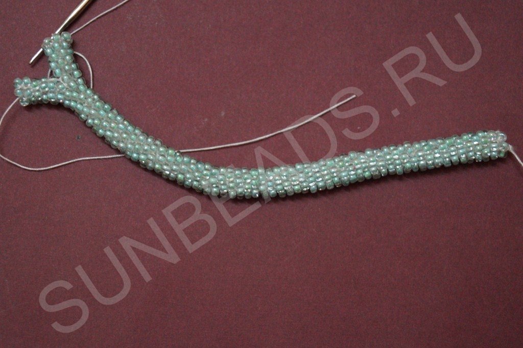 После третьего ряда ввязываем бисерины по кругу, как и для первого ответвления. Примечание: количество бисерин в диаметре и первого и второго хвостика должно быть одинаково. В данном случае ответвление состоит из двенадцати бисерин.