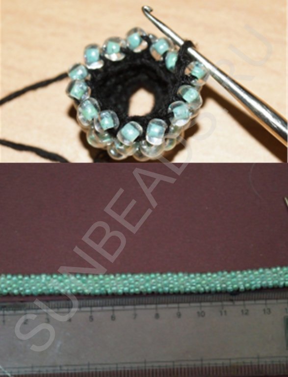 Аналогично, как и для первого ответвления три первых круга вяжем по принципу: до «мостика» ввязываем бисерины, затем простые столбики без накида. Так выглядит первый круг:
