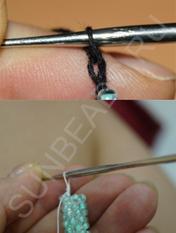 Протягиваем эту нить под новой бисериной в отверстие впереди первой бисерины второго ряда. Получается вот такая пара петель: