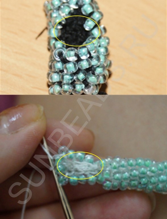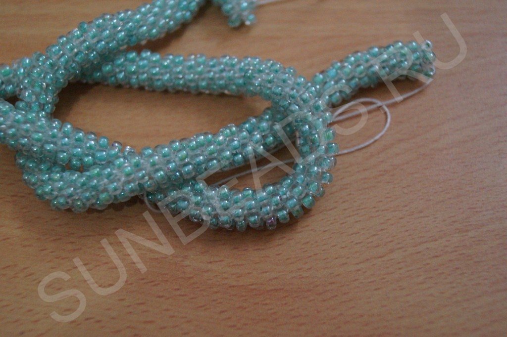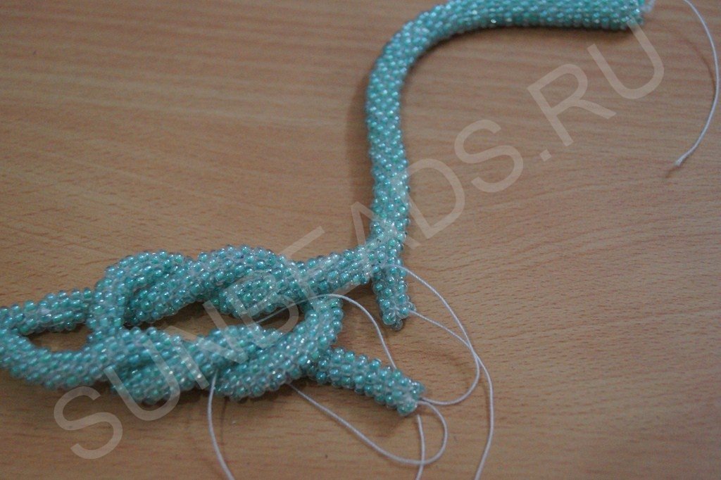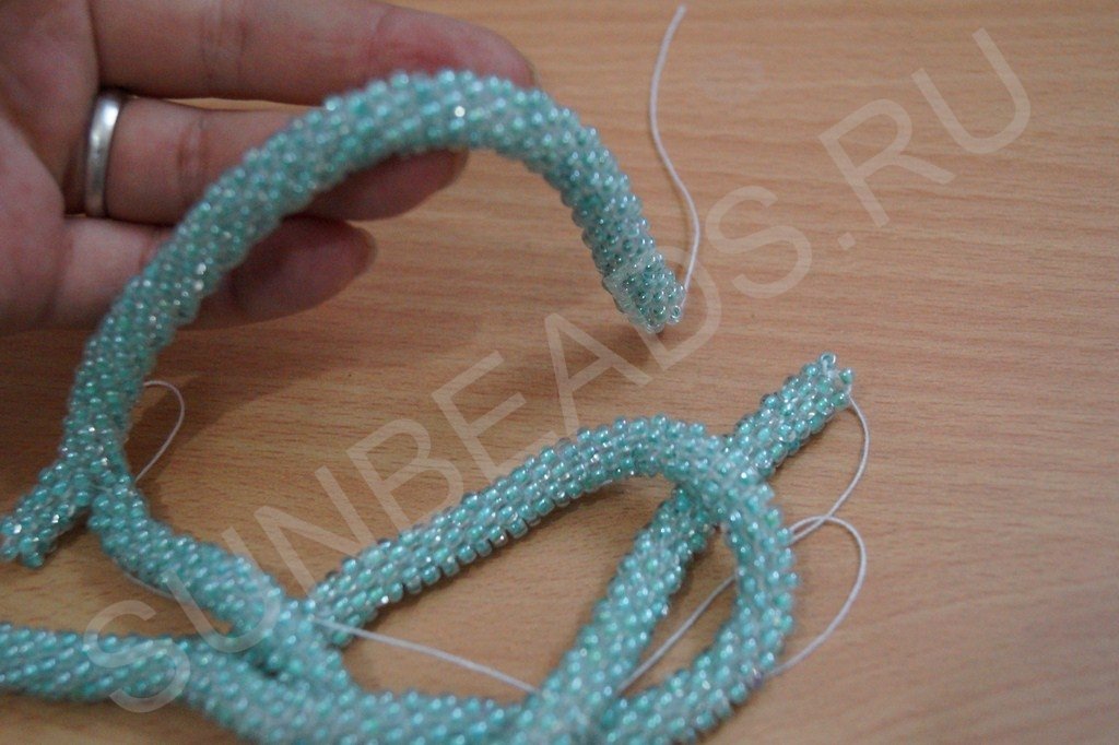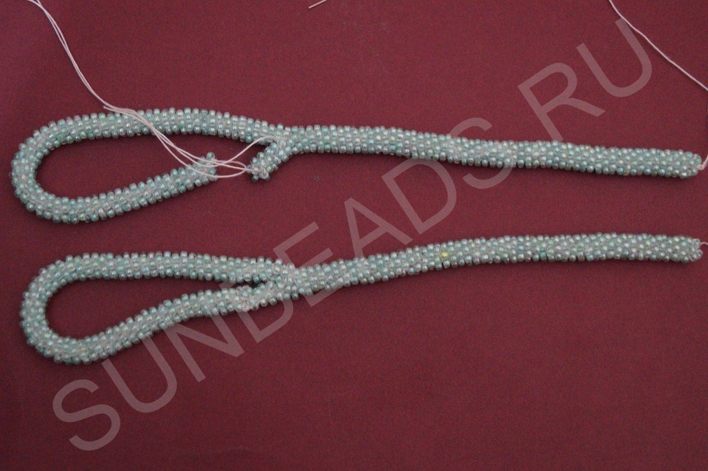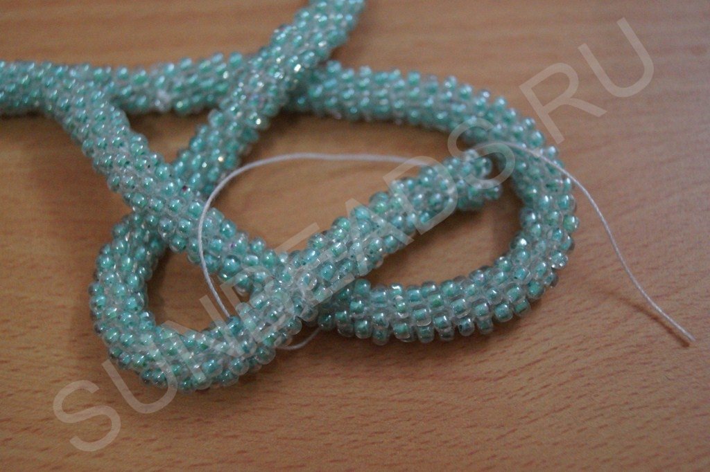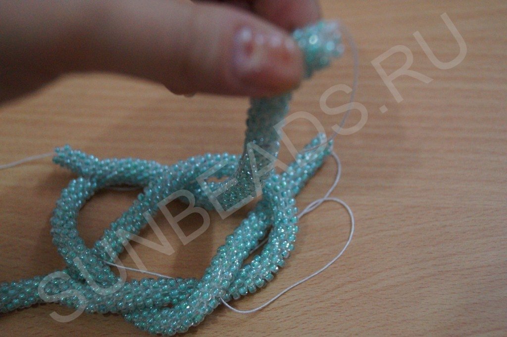 Материала набираем достаточное количество. Если в процесс выяснится что бисера мало, то нитку, идущую от жгутика можно отрезать, снова набрать бисер и соединить кончики ниток с бисером и жгутиком вместе.
