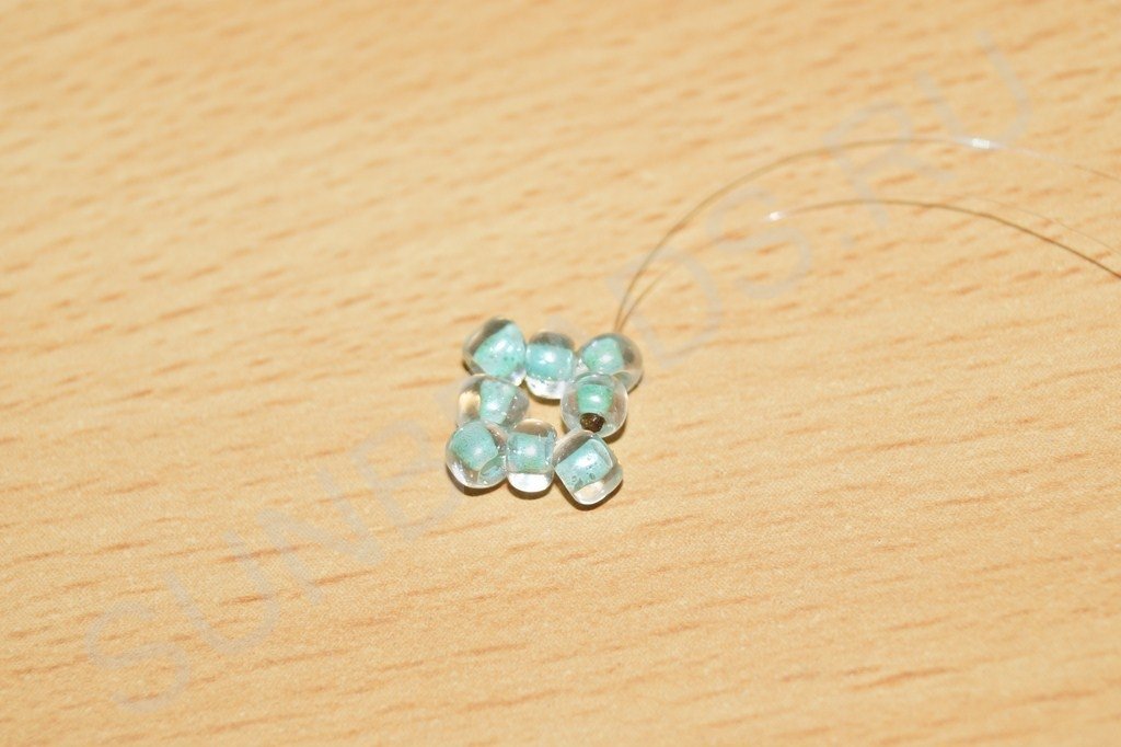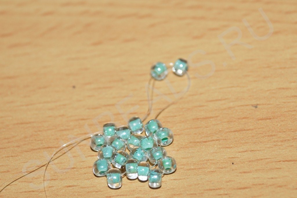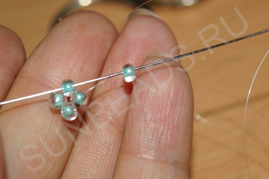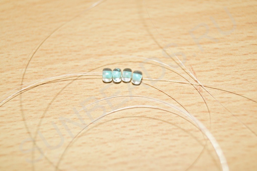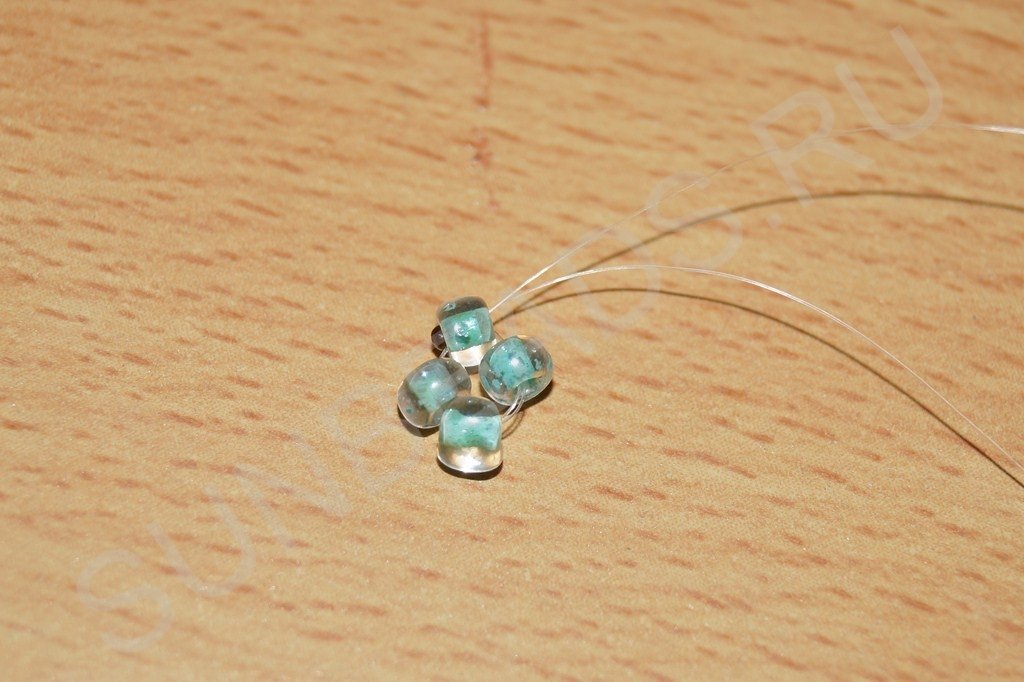 Теперь по этапам работы. Набираем на мононить четыре бисерины: