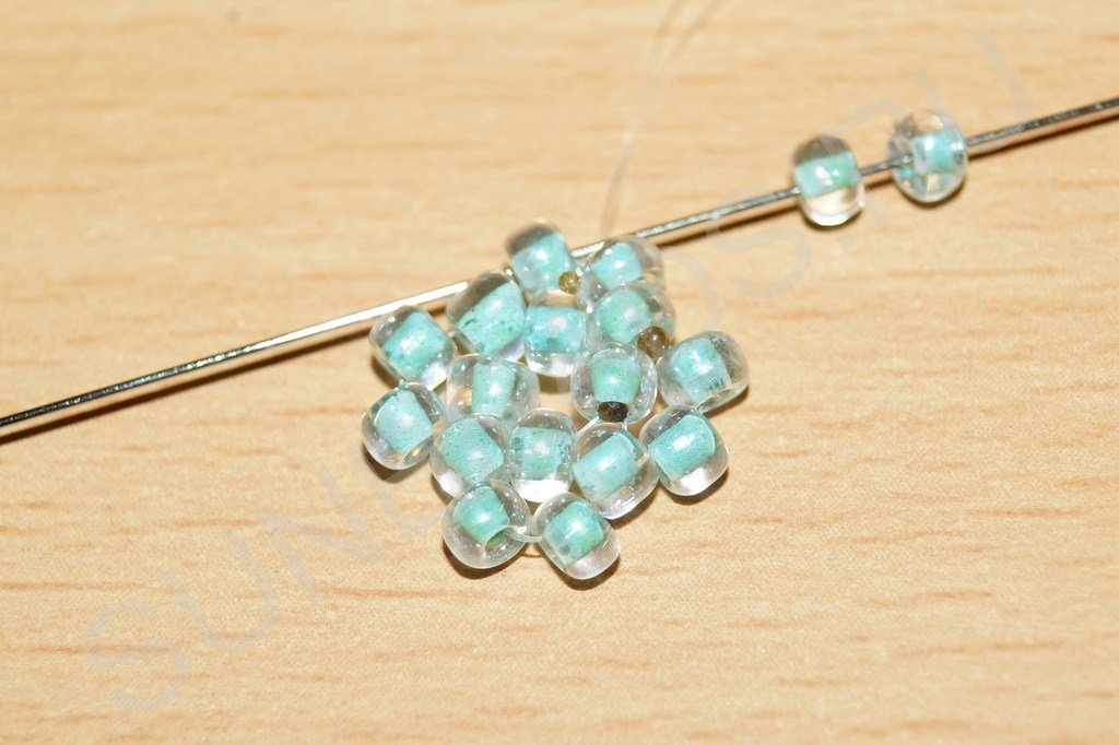 Так же как и первую бисерину, ввязываем в полотно оставшиеся бисерины. Для самого украшения это шесть бисерин по кругу. Два ряда готово.