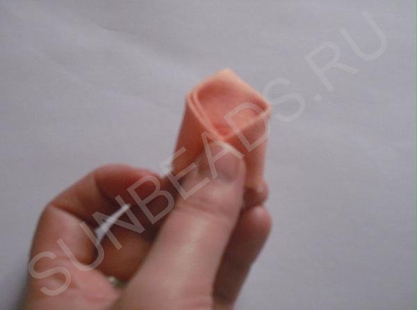 Теперь верхушки треугольника следует отметить 3 см и отрезать все излишки. Получившиеся края необходимо оплавить с помощью зажигалки и сразу же крепко сжать пальцами обожженные края, чтобы они склеились между собой. После этого лепесток готов, его можно аккуратно расправить.