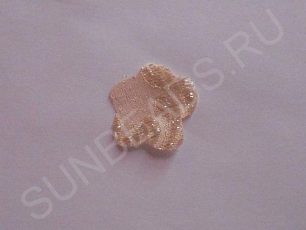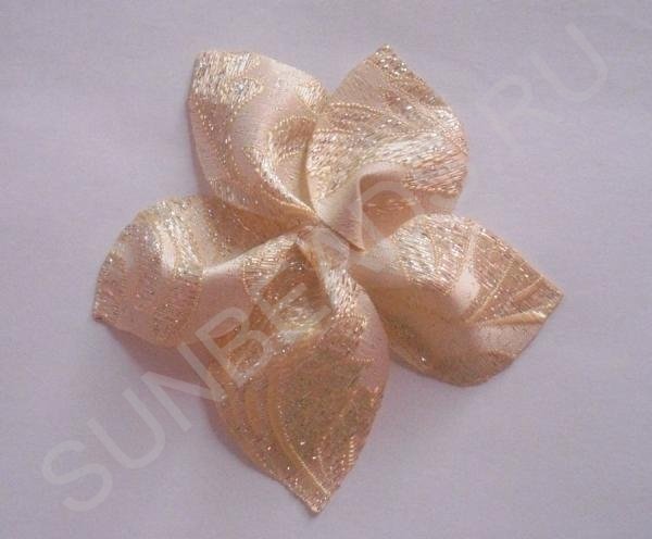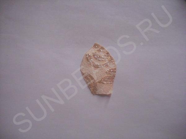 Далее нужно сделать нижний цветок. Для этого потребуется взять 5 лоскутов из белой ткани с блестящим рисунком и вырезать из них большие листочки.
