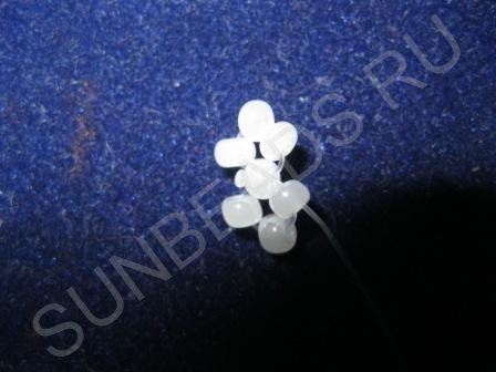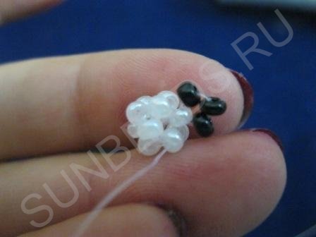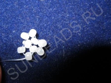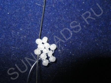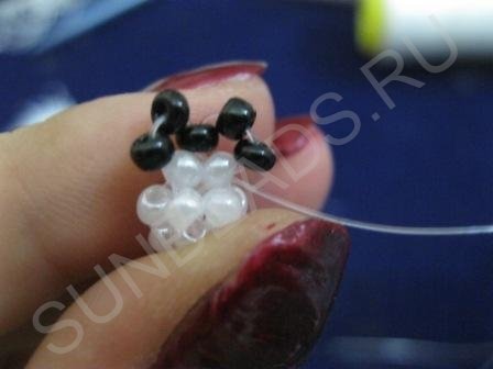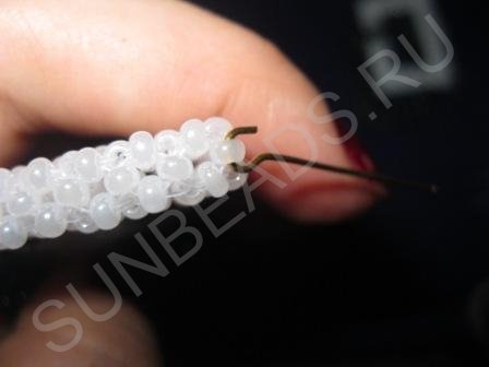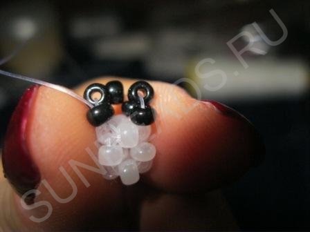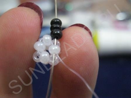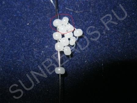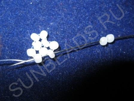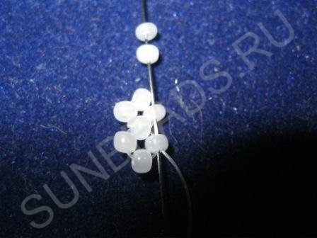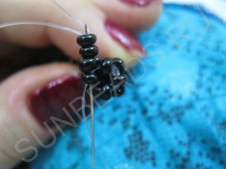 Набираем одну бисеринку и протягиваем леску через три левых нижних бусины: