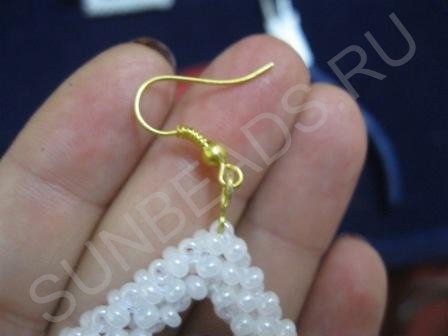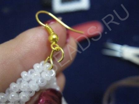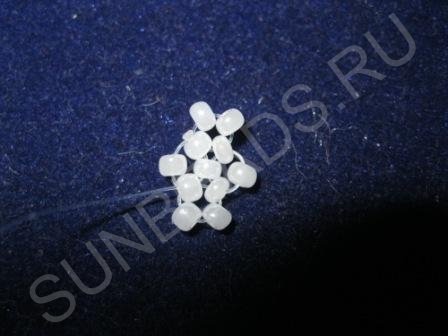 По внутренне грани: проходим иголкой в нижнюю бусину. Нанизываем два элемента. Иголкой захватываем боковую бисерину только что созданного четырехугольника, пронизываем еще раз нижнюю бусину: