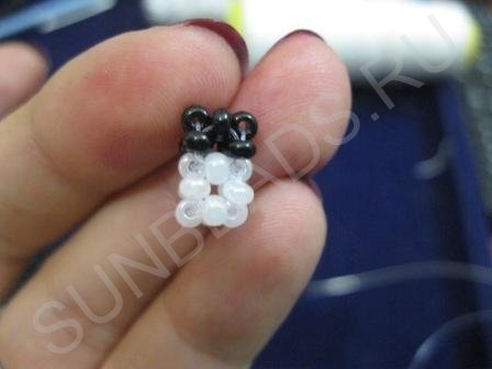 Набираем две бусины и проходим иголкой сверху вниз по двум боковым бисеринам:
