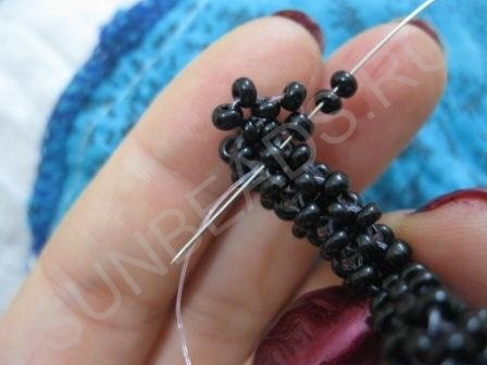 Набираем две бисеринки, проходим через нижнюю бусину крайнего четырехугольника и через нижнюю бусину самого нижнего четырехугольника:
