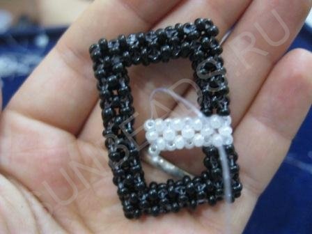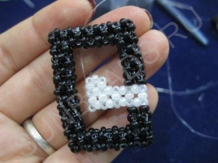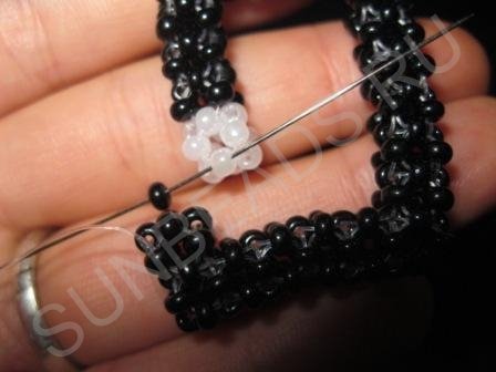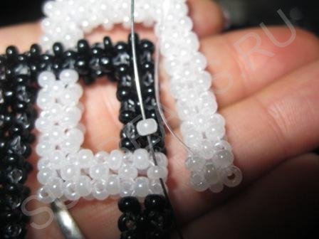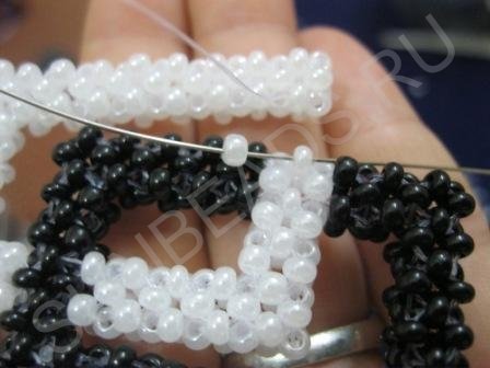 Теперь приплетаем к данному фрагменту белый элемент. Техника плетения абсолютно аналогична предыдущему процессу: