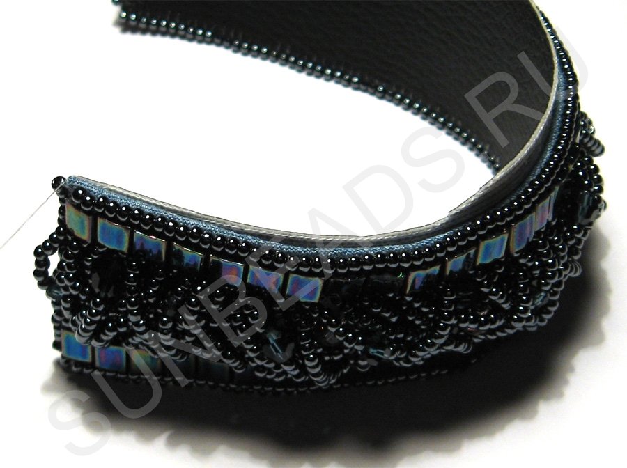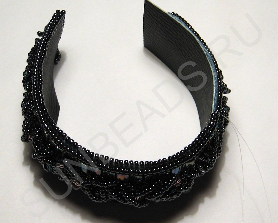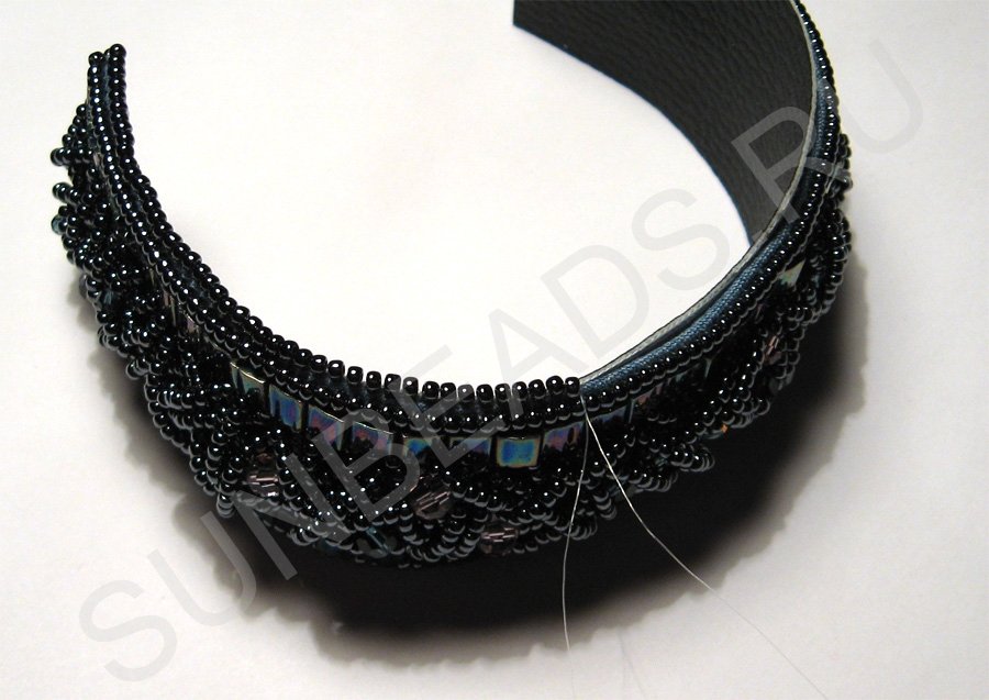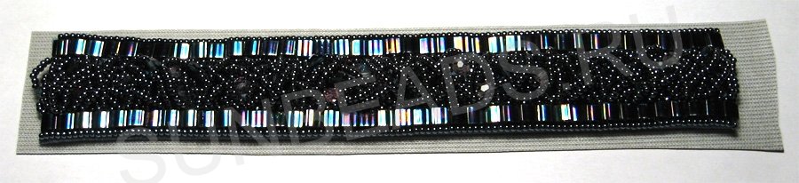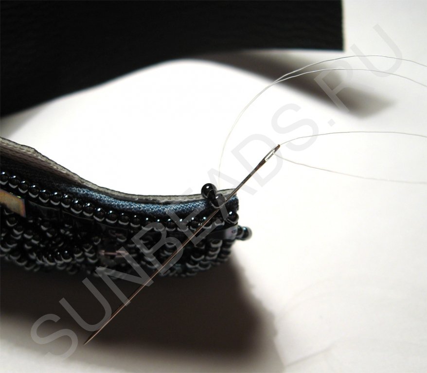 Здесь бисерины, которые используются для сшивания, расположены так по отношению к краям вышивки, что их отверстия перпендикулярны.