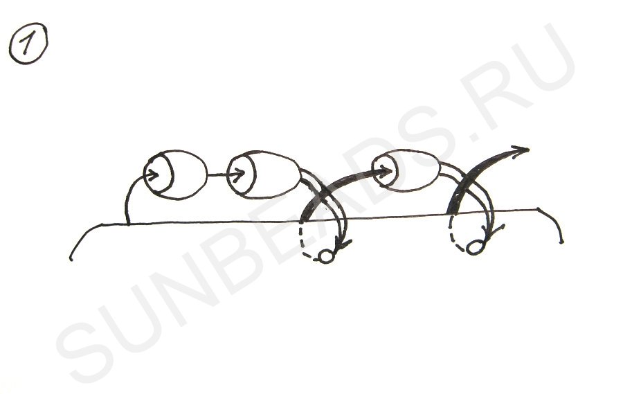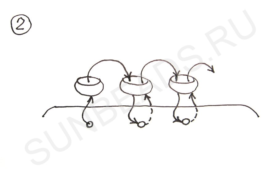 Набираем 2 бисерины и вставляем иглу правее на расстояние 2-х бисерин.