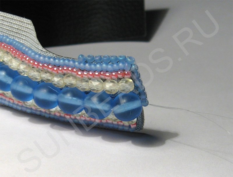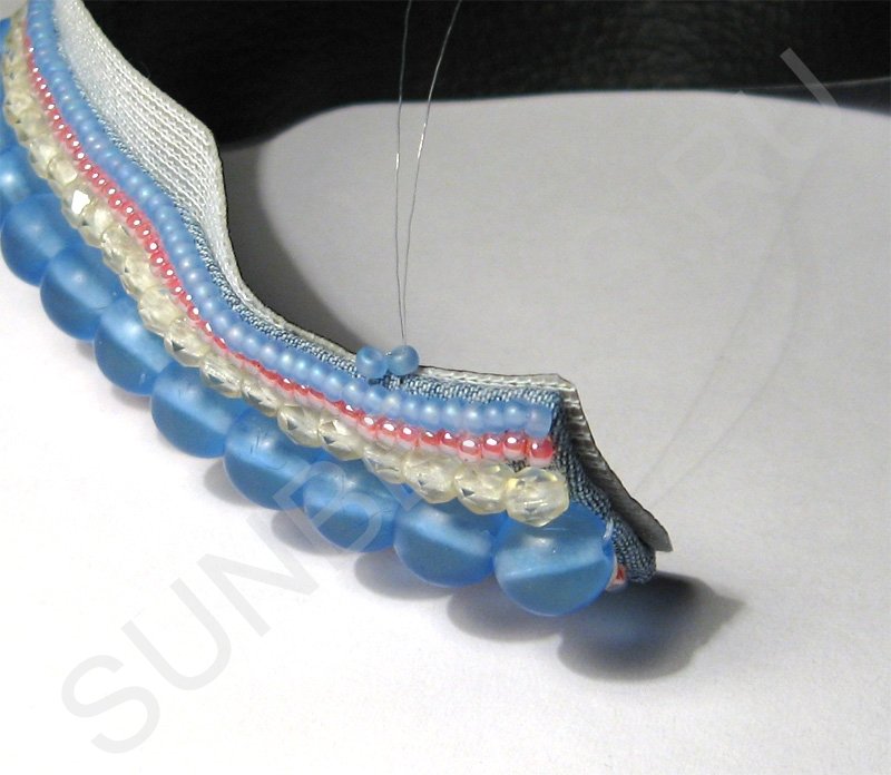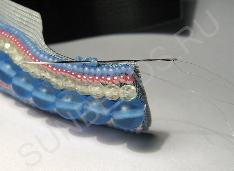 При сшивании слоев добавляется бисер, который закрывает торцы (кромки). Отличаются способы сшивания слоев тем, как располагается бисер. В первом способе бисер расположен боком к краям вышивки: