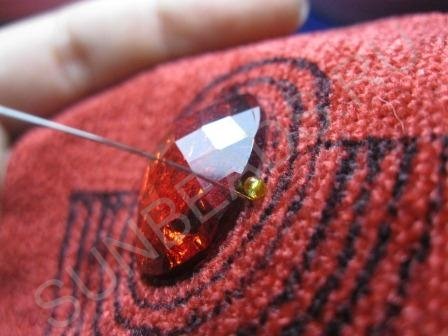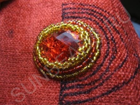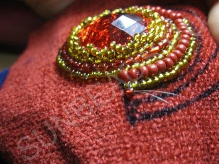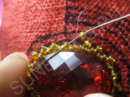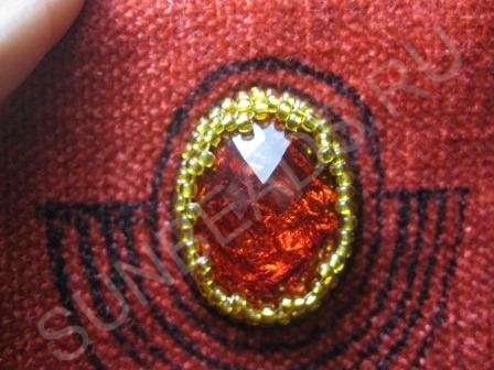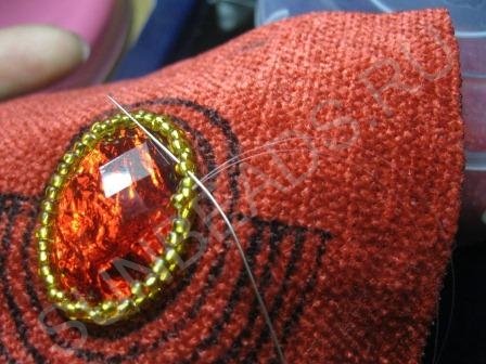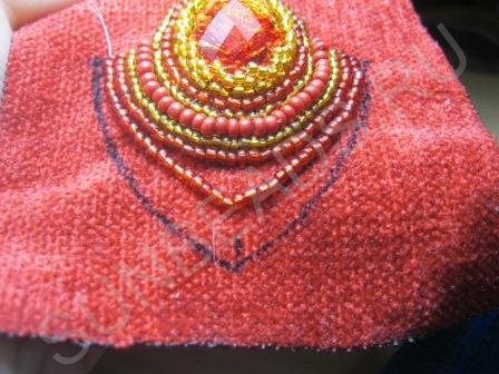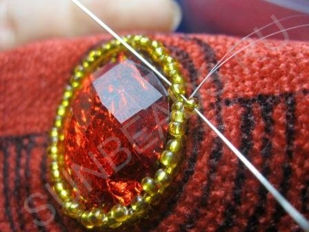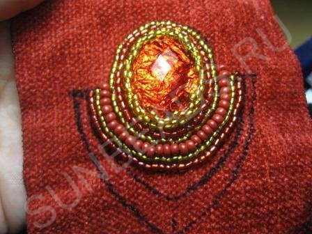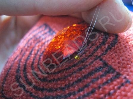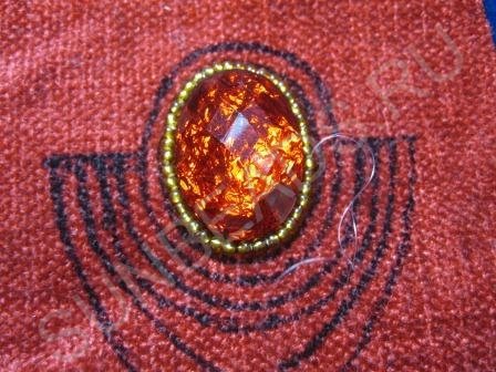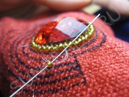 Приклеиваем кабошон к ткани. Приступаем к вышиванию. Процесс проходит по схеме: нанизываем бисерину и закрепляем ее к ткани. При этом иголка всегда выходит вперед: