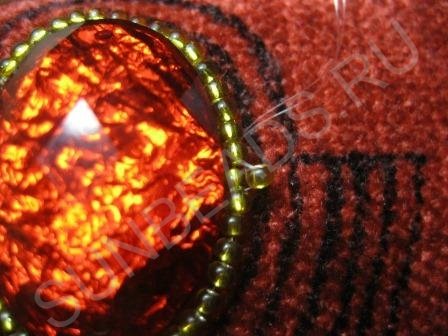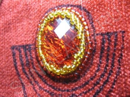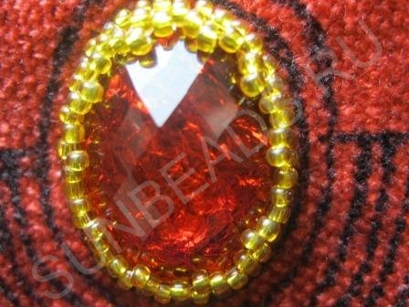 Так как кабошон невысокий, хватило трех рядов, чтобы его оплести. Теперь приступаем к сужению. Для этого работаем по мозаичной схеме с пропуском одной бисерины: набираем бисеринку, проходим в диагональное звено, затягиваем.