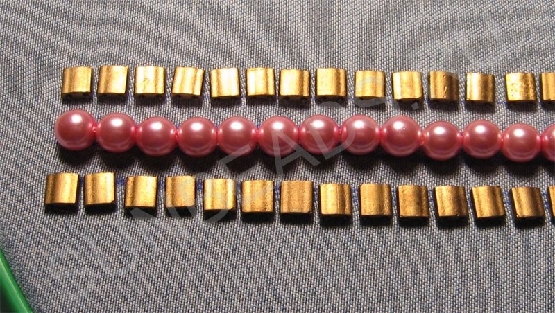 Между плоским бисером и жемчугом вдоль будем пришивать круглый бисер дугами немного зигзагообразно. Пришивайте как можно плотнее и гуще, каждый раз набирая разное количество бисера. Старайтесь заполнить все пространство.