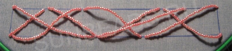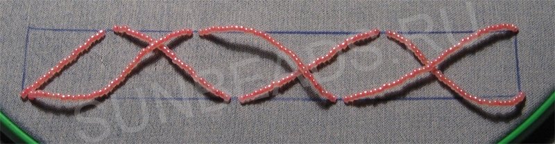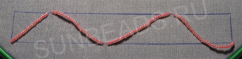 Пришиваем бисер дугами большими зигзагами. Заполняем весь прямоугольник. В некоторых дугах добавляем по одному или два лепестка.