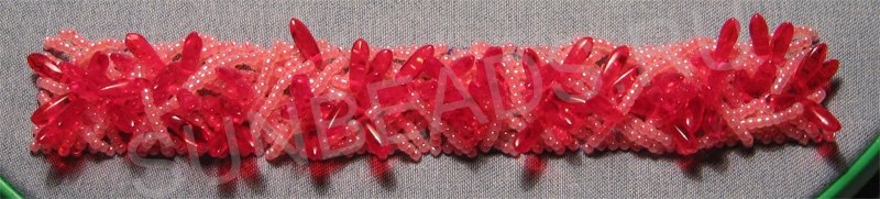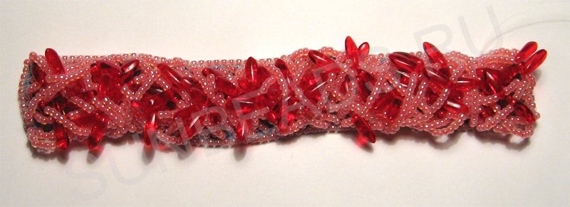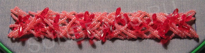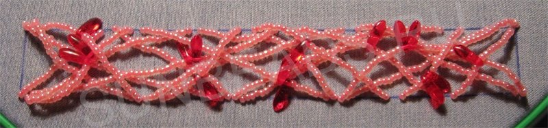 Теперь торцы вышивки сшиваем нитями бисера, хаотично переплетая их. Длина нитей должна быть такая, чтобы в итоге получился нужный диаметр браслета.