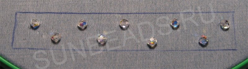 Пришиваем кристаллы Сваровски вразброс в этом прямоугольнике. Количество бусин на ваш вкус. Я пришила 9 бусин.