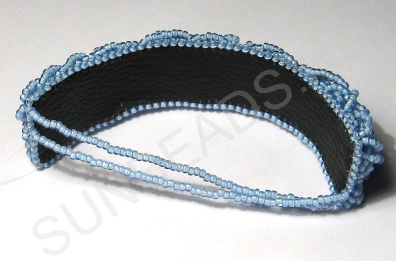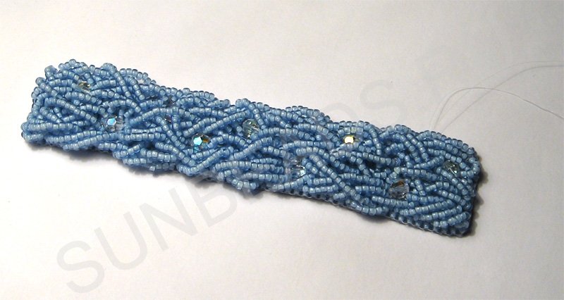 Сшиваем торцы вышивки нитями бисера, переплетая их зигзагами. Длину нитей подбирайте так, чтобы в итоге получилась нужная длина браслета.