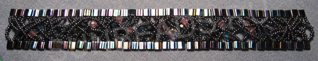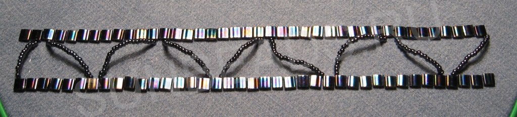 По бокам браслета мы пришьем плоский бисер Miyuki Tila. А посередине будет круглый бисер, пришитый дугами поперек.
