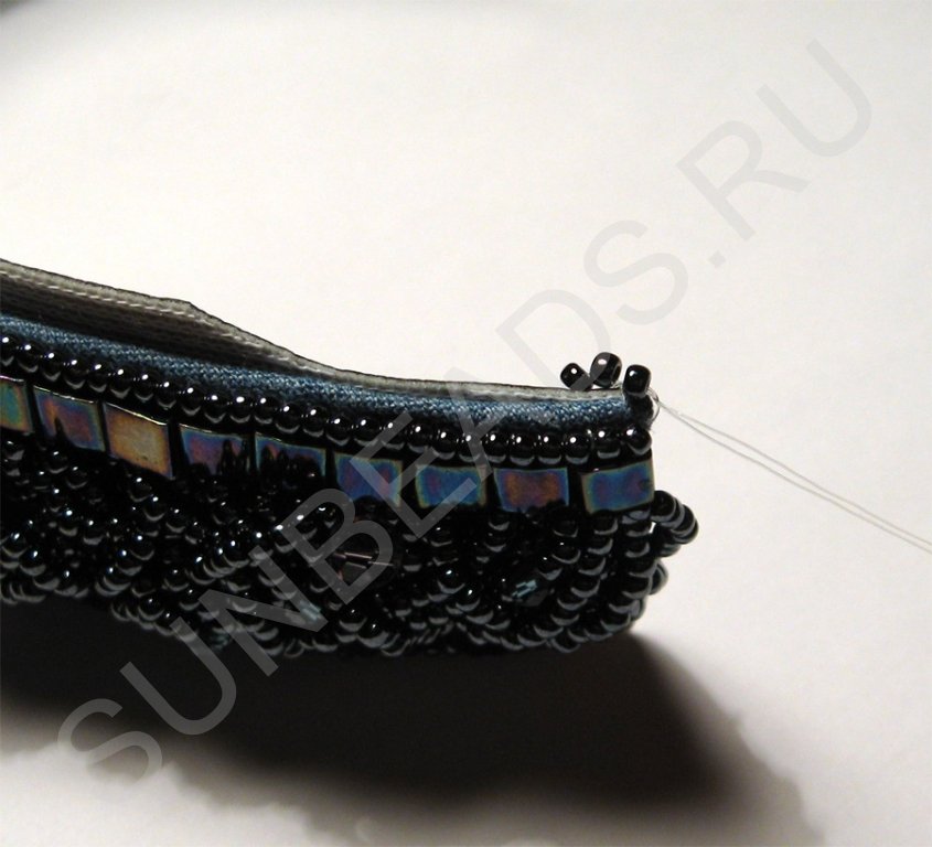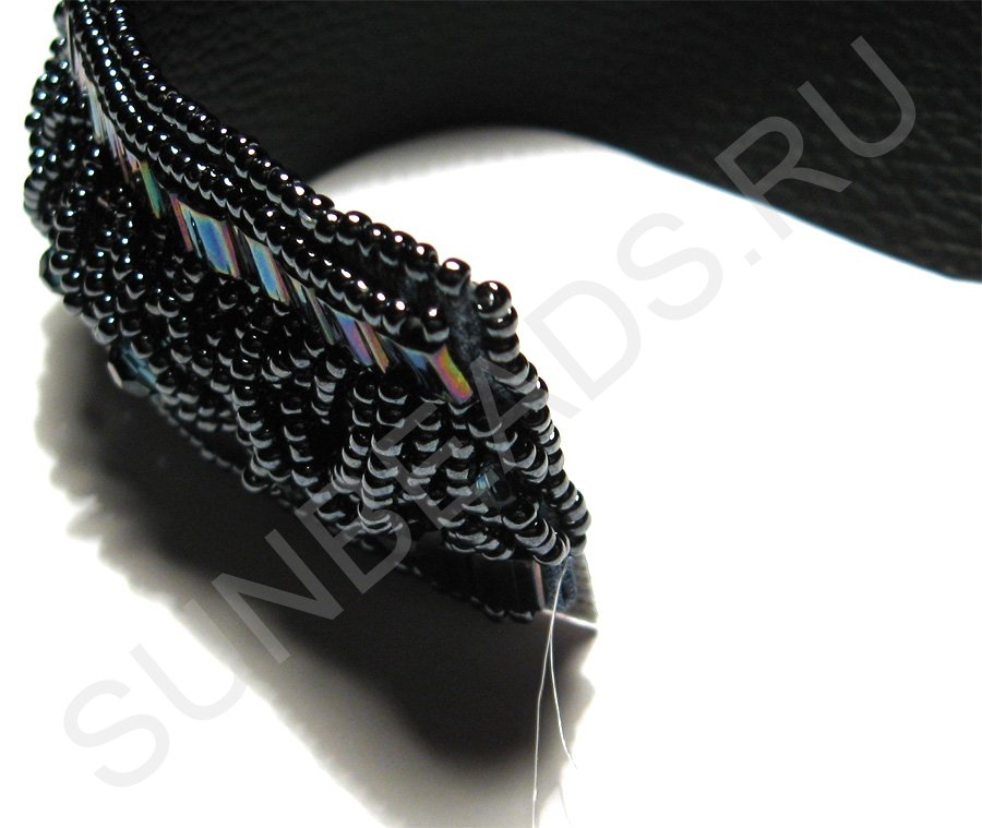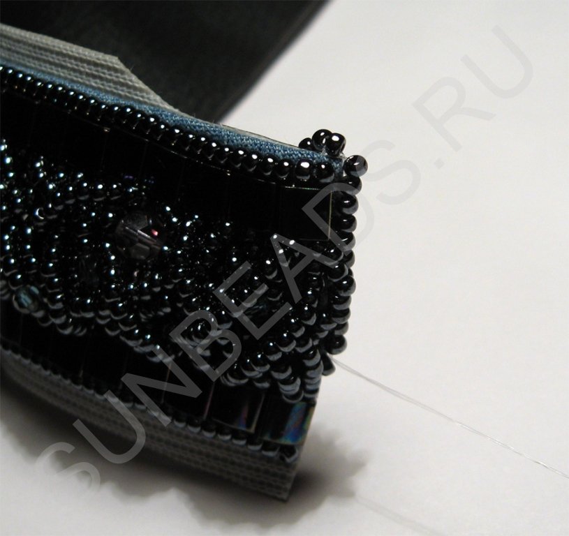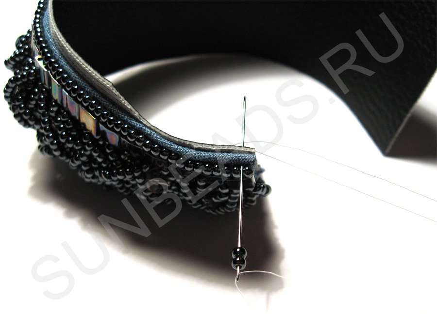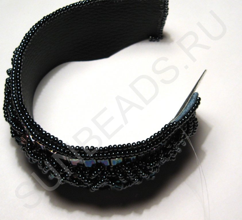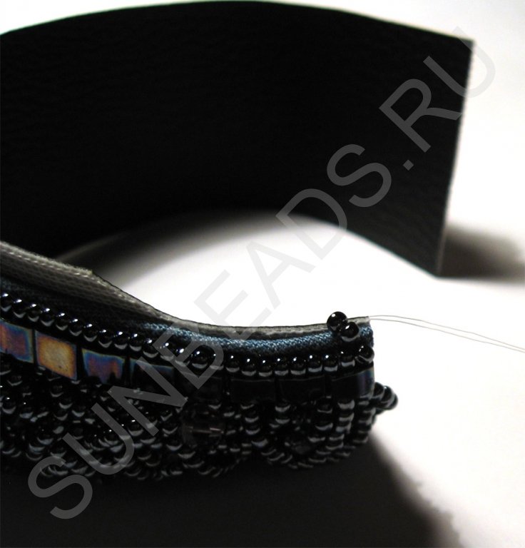 По краям браслета с обеих сторон пришьем круглый бисер в один ряд.