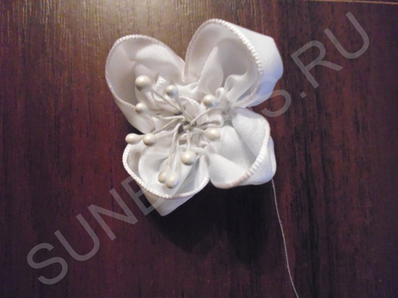 Вставляем в серединку круга из четырех лепестков пучок тычинок и пришиваем их. Тычинки слегка изгибаем, придавая им некоторую беспорядочность. Если вы не найдете проволочные тычинки, не огорчайтесь, можно взять и двухсторонние ниточные, только их нужно в два раза больше.