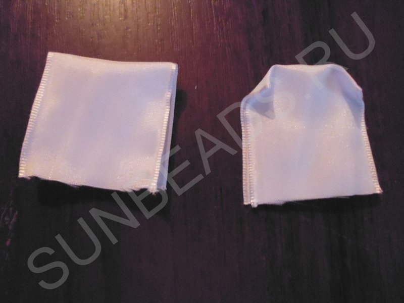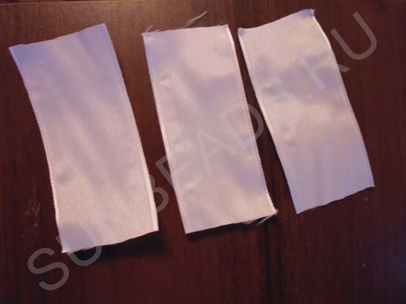 Приступаем к изготовлению листьев из органзы. Отрезаем два куска ленты по 10 см. Берем один кусок и загибаем края ленты вниз.