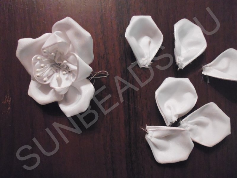 Теперь поворачиваем лепесток закрученными углами вниз. По лицевой стороне лепестка, по нижнему краю нужно сделать две складки в одном направлении и прошить мелкими стежками. Лепесток готов.