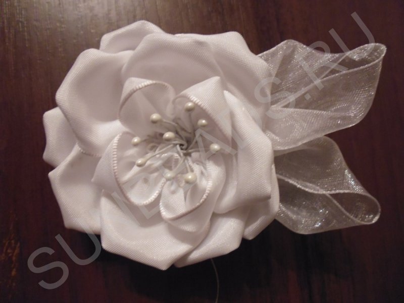 Подшиваем оба листика с тыльной стороны розы так, что бы закрыть края проволоки в центре цветка. Белая чайная роза готова.