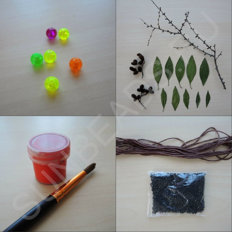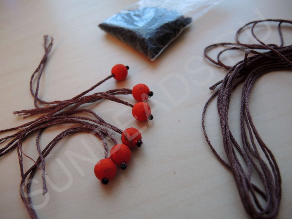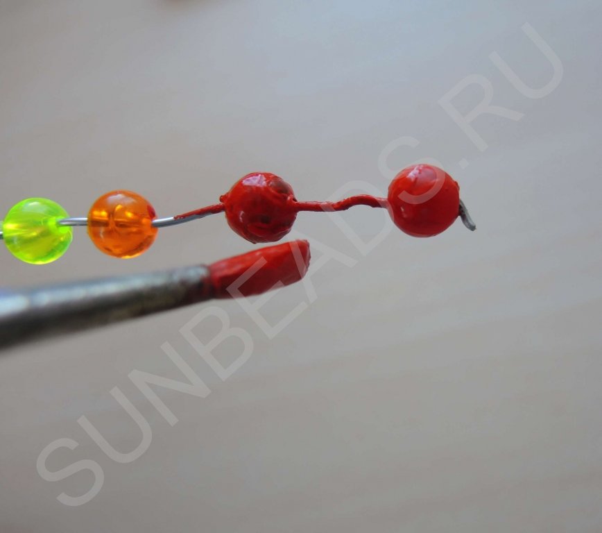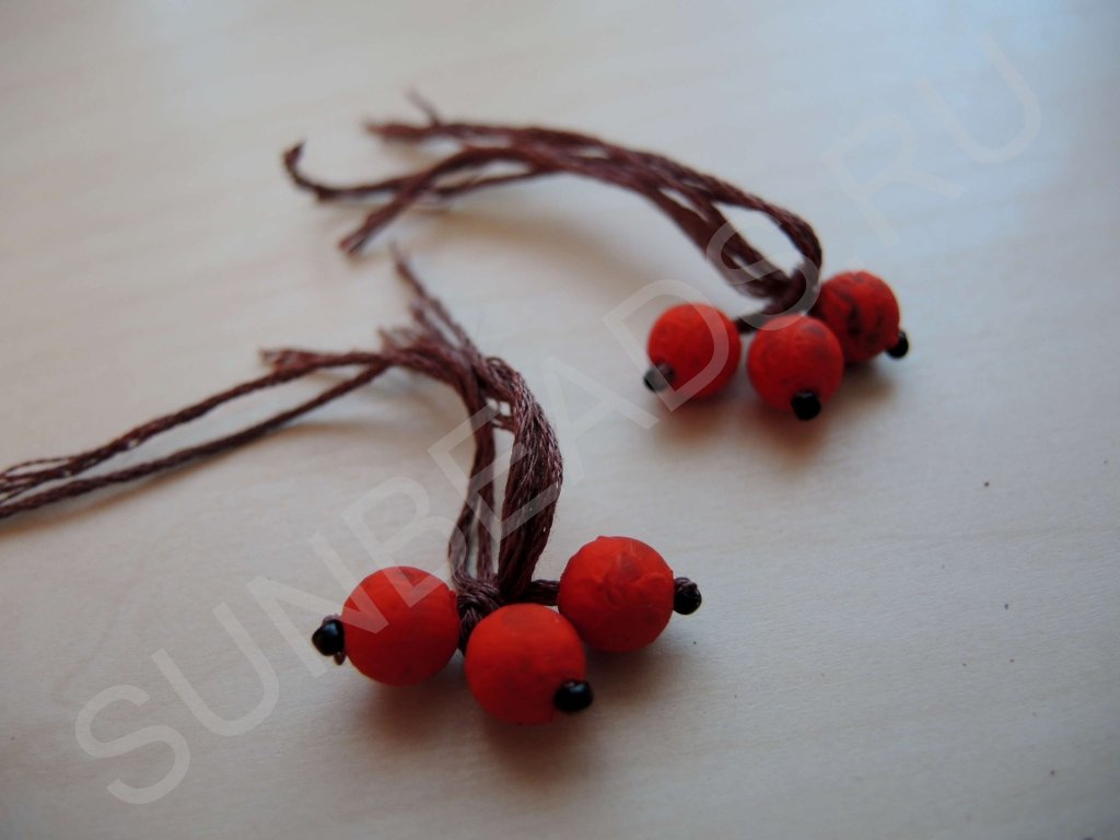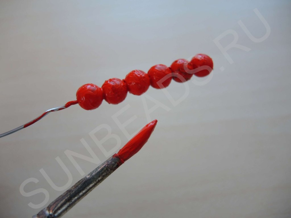 Когда краска высохнет, можно будет приступить к созданию ягод. Для каждой ягоды нам понадобятся примерно 15-20 см нити, бусина и черная бисерина.