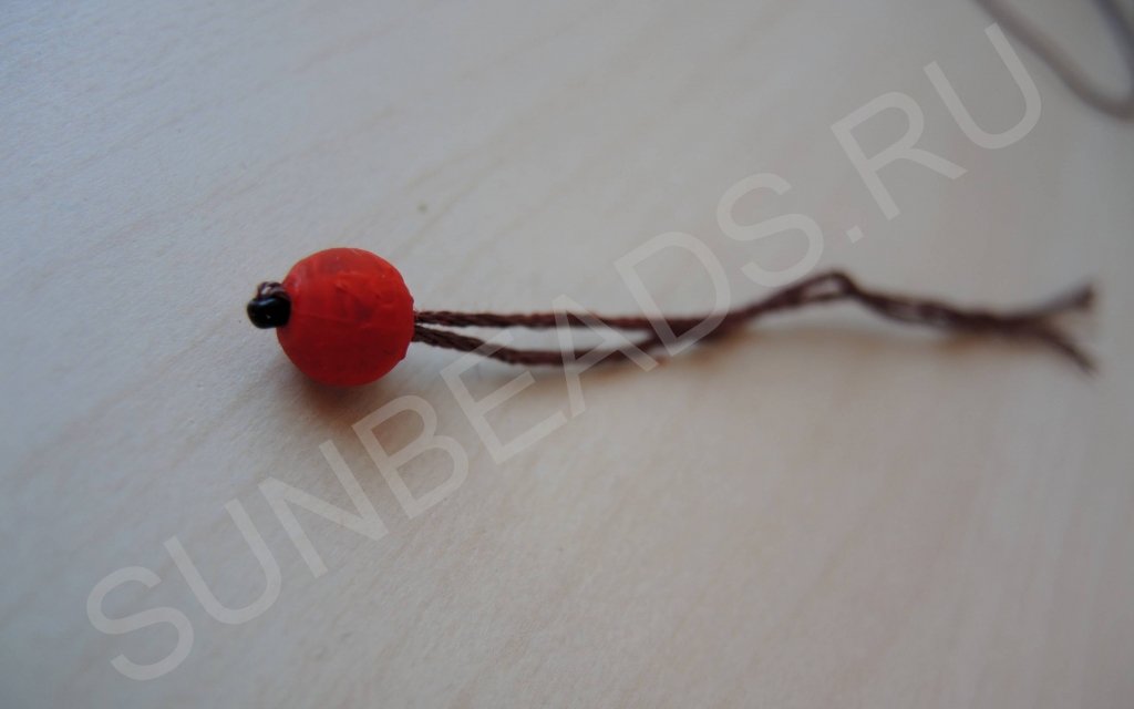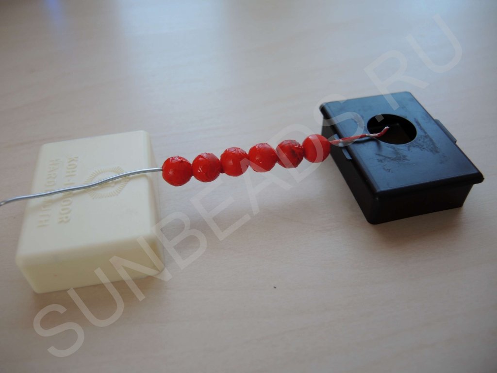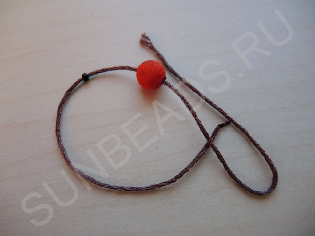 Надеваем бусину и бисерину на нить так, чтобы красная бусина располагалась примерно посередине.