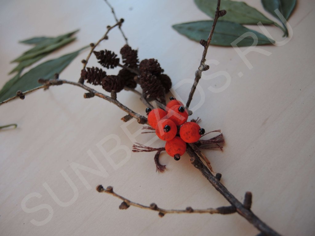 Крепим ягоды к ветке, одновременно с ними можно привязать и веточку с шишками. Хвостики ниток можно не прятать, а лишь ровно подстричь.