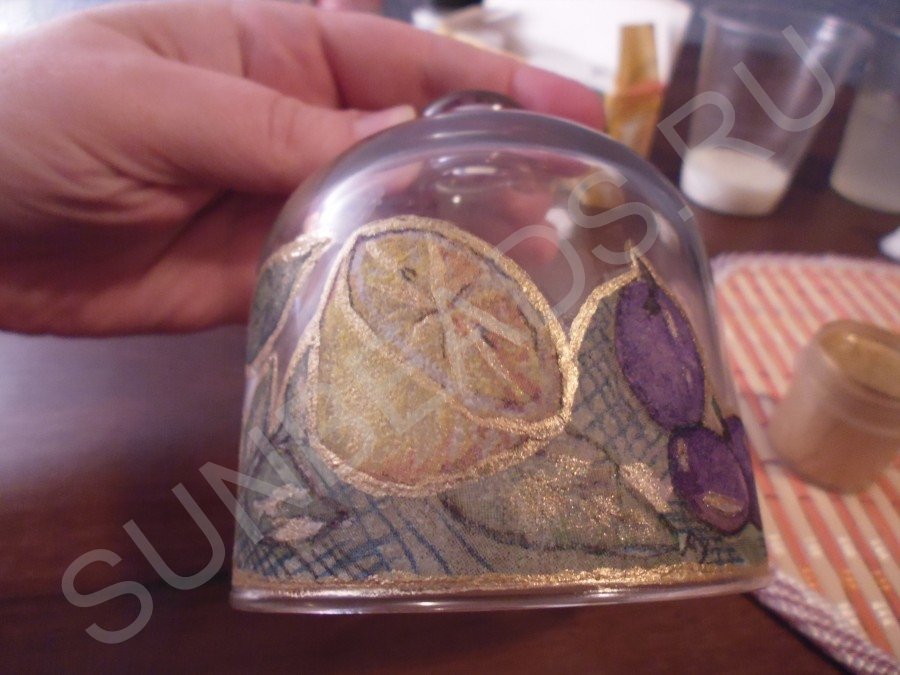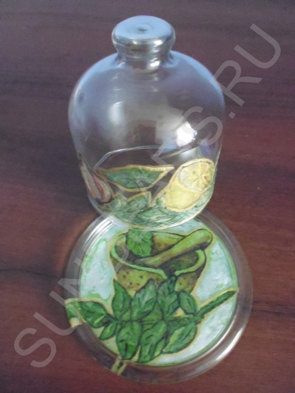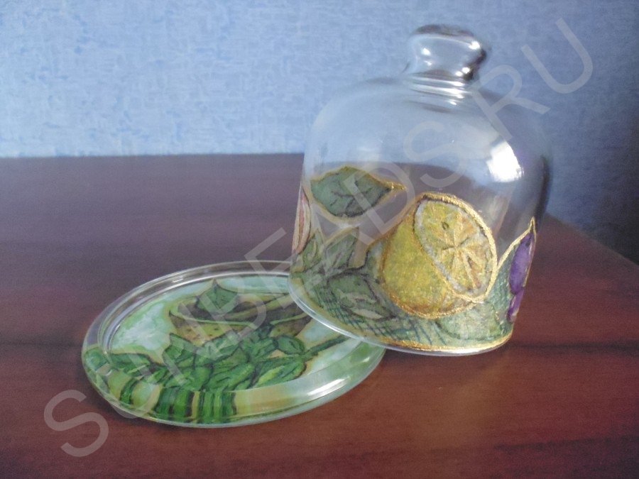 На кухне женщина проводит достаточно много времени, сооружая кулинарные шедевры. После окончания работы часто остается кусочек неиспользованной луковицы, половинка лимона и т.д. Для кратковременного хранения подобных продуктов придумали множество всевозможных приспособлений. Мне больше нравятся изделия из стекла, так как видно, что же лежит на блюдце. Используя оригинальную технику декупажа можно обычное стеклянное блюдо для лимона с крышкой превратить в изысканную кухонную вещь. В данном мастер-классе мы использовали две техники декупажа: прямой и обратный, и вот, что у нас получилось.