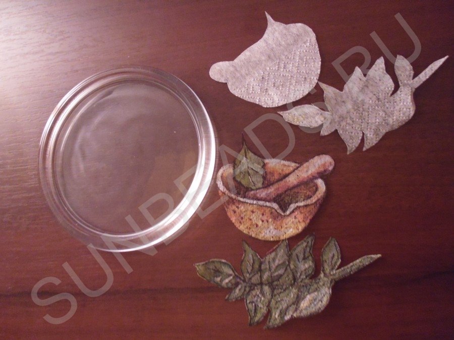 Спиртом обезжириваем поверхность стеклянной крышки. На столе выкладываем рисунок для крышки из цветных элементов, а белые части (в той же последовательности) приклеиваем по одному на стекло так: накладываем на крышку и при помощи синтетической кисти с клеем сверху разглаживаем фрагмент от центра к краям. Следим, чтобы не образовывались складки и не оставались пузырьки воздуха под салфеткой. Даем полностью высохнуть.