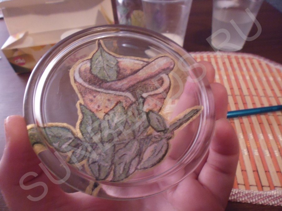 Приступаем к декорированию блюдца. Украшать будем в технике обратного декупажа, так как дно блюдца будет постоянно подвергаться агрессивному воздействию лимонного сока. Обратный декупаж так и называется потому, что делается с обратной стороны изделия и в обратном порядке.