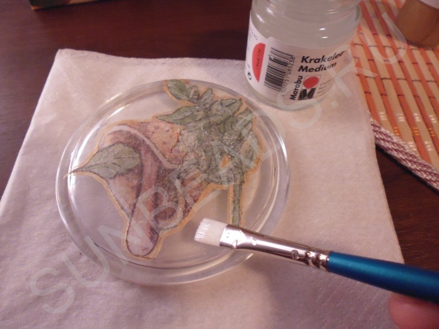 На свободное от рисунка пространство с тыльной стороны наносим лак «Кракелюр» плоской синтетической кистью. Даем ему немного подсохнуть (поверхность должна липнуть).