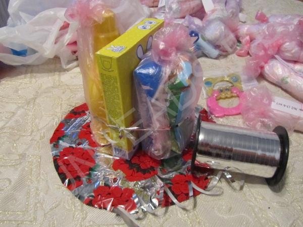 Для украшения были использованы: пустышка, погремушка, царапки, носочки, чепчик, масло для тела, костюмчик и искусственные цветочки.