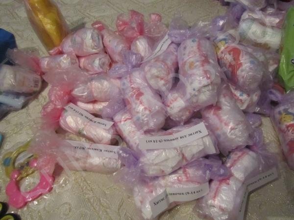 Параллельно с этим я открыла все упаковки с подгузниками и каждый подгузник упаковала в обычный пищевые пакетики разных цветов розовые и сиреневые. В каждый пакетик с подгузнико положила листочек с его названием и расчетом на вес ребенка.