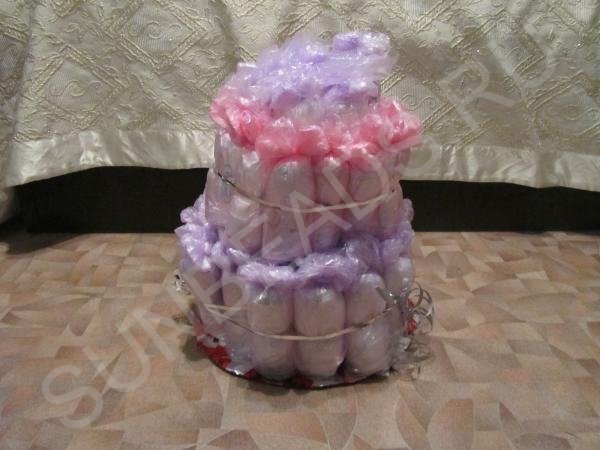 Добавляем к основанию из порошка жидкое мыло и формируем из подгузников первый слой торта. Все подгузники хорошенько связываем лентой.