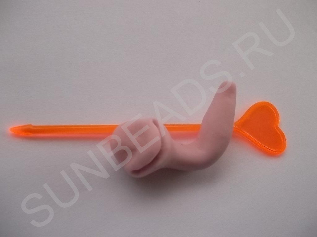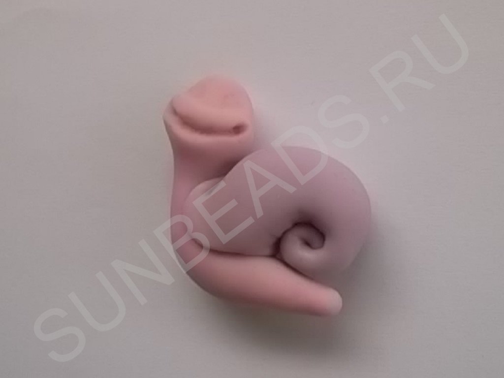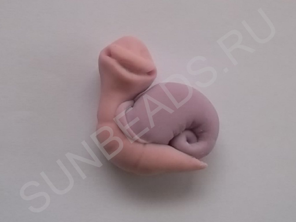 - Хорошенько разминаем полимерную глину до мягкости. Катаем колбаску, формируя с одного конца небольшой шарик, это будет тельце с головой.